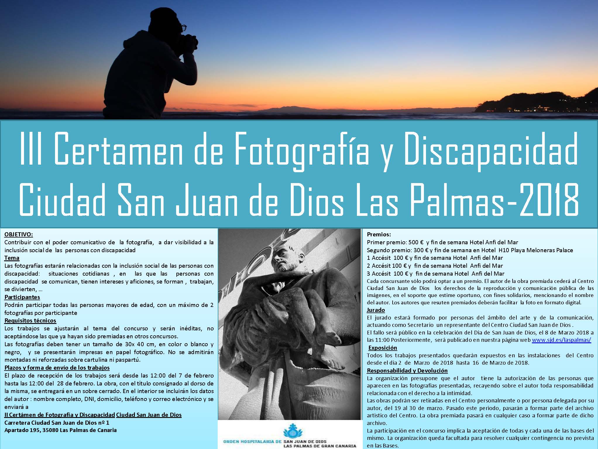 La tercera edición del Certamen de Fotografía y Discapacidad Ciudad San Juan de Dios Las Palmas ha abierto el plazo de recepción de trabajos, que se prolongará hasta el próximo 28 de febrero, a las 12:00 horas. El objetivo del concurso es dar visibilidad a la inclusión social de las personas con discapacidad a través del poder comunicativo de la fotografía.