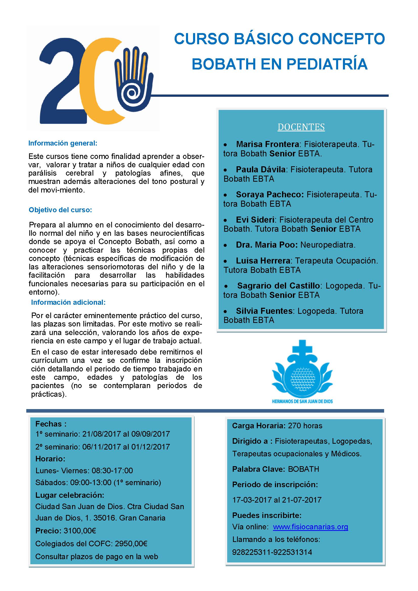 Las instalaciones de la Ciudad de San Juan de Dios de Las Palmas de Gran Canaria acogen, desde el próximo 21 de agosto y hasta el día 1 de diciembre, la celebración del Curso Básico Concepto Bobath en Pediatría, que se desarrolla en Canarias por primera vez.
